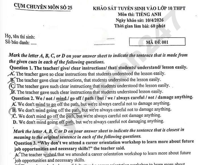 Đề thi thử môn Anh vào lớp 10 năm 2026 - Cụm chuyên môn 25 HN Mark the letter A, B, C, or D on your answer sheet to indicate the sentence that is made from the given cues in each of the following questions. Question 1. The teacher/ give/ clear instructions/that/students/ understand/ lesson easily. A. The teacher gave so clear instructions that students understood the lesson easily. B. The teacher gave clear instructions, that students understood the lesson easily. The teacher gave such clear instructions that students understood the lesson easily. D. The teacher gave such clear instructions that students understood lesson easily.