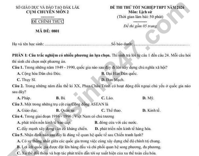 Đề thi thử môn Sử tốt nghiệp THPT 2026 - Cụm chuyên môn 2 Đắk Lắk Câu 4. Cho đoạn tư liệu sau đây: "Kết hợp sức mạnh dân tộc với sức mạnh thời đại, vì sự nghiệp dân tộc và nghĩa vụ quốc tế. Đấu tranh giữ vững hòa bình ở Đông Dương, góp phần gia giữ hòa bình ở Đông Nam Á, ở châu Á - Thái Bình Dương và trên thế giới, chống chính sách của các giới để quốc chạy đua vũ trang và gây nguy cơ chiến tranh hạt nhân, tranh thủ điều kiện quốc tế thuận lợi cho sự nghiệp xây dựng chủ nghĩa xã hội và bảo vệ Tổ quốc Phát triển và củng cố quan hệ đặc biệt giữa ba nước Việt Nam, Lào và Campuchia; đoàn kết và tôn trọng độc lập, chủ quyền của mỗi nước, hợp tác toàn diện, giúp đỡ lẫn nhau xây dựng và bảo vệ Tổ quốc". (Đảng Cộng sản Việt Nam, Văn kiện Đảng toàn tập, Tập 47, NXB Chính trị quốc gia, Hà Nội, 2006, Tr. 908).