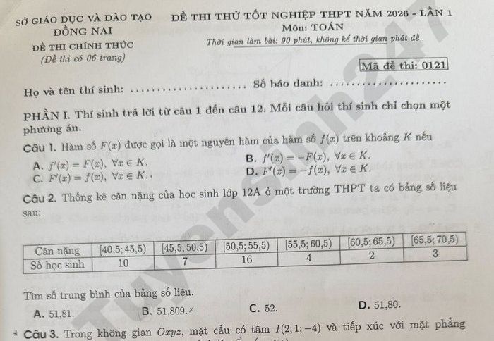 Đề thi thử môn Toán tốt nghiệp THPT 2026 - Sở GD Đồng Nai (lần 1)