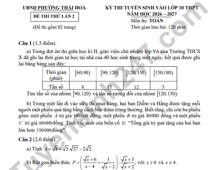 Đề thi thử môn Toán vào lớp 10 lần 2 năm 2026 - THCS Hòa Hiếu 2 (có đáp án) Câu 3 (2,5 điểm). a) Trong kỳ thi Tuyển sinh vào lớp 10 THPT năm học 2026 - 2027, tổng chỉ tiêu tuyển sinh của hai trường THPT A và THPT B là 1200 học sinh. Sau khi hết hạn đăng ký và điều chỉnh nguyện vọng, số lượng thí sinh đăng ký dự tuyển vào trường A và trường B tăng lần lượt là 15% và 10% so với chỉ tiêu ban đầu. Do đó, tổng số thí sinh đăng ký dự tuyển của cả hai trường là 1345 học sinh. Tính chỉ tiêu tuyển sinh ban đầu của mỗi trường. b) Hai bạn An và Minh ở cùng một khu dân cư và học cùng một trường THCS cách nhà 13km. Mỗi buổi sáng, hai bạn cùng xuất phát từ nhà đến trường bằng xe đạp điện vào cùng một thời điểm. Biết vận tốc trung bình của Minh lớn hơn của An là 2km/h nên Minh đến trường sớm hơn An 2,5 phút. Tính vận tốc trung bình của mỗi bạn (theo đơn vị km/h ) và cho biết trong hai bạn, bạn nào đã tuân thủ đúng quy định về tốc độ tối đa của xe đạp điện (không được vượt quá 25km/h)?