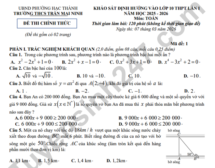 Đề thi thử môn Toán vào lớp 10 năm 2026 lần 1 - THCS Trần Mai Ninh (có đáp án) Câu 12. (1,0 điểm) (Giải bài toán bằng cách lập phương trình hoặc hệ phương trình) Để phục vụ công tác bảo đảm an ninh, trật tự, an toàn giao thông, hai phường Hạc Thành và Đông Sơn tham gia lắp đặt camera Al. Trong tháng thứ nhất, cả hai phường đã lắp được 180 chiếc camera. Sang tháng thứ hai, phường Hạc Thành vượt mức 10%, phường Đông Sơn vượt mức 12% so với tháng thứ nhất nên cả hai phường đã lắp được 200 chiếc. Hỏi trong tháng thứ nhất, mỗi phường lắp được bao nhiêu chiếc camera?