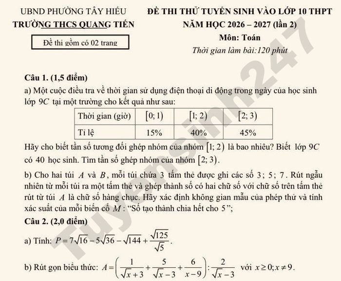 Đề thi thử môn Toán vào lớp 10 năm 2026 - THCS Quang Tiến lần 2 a) Một hình chữ nhật có chu vi là 96m. Biết rằng nếu tăng chiều rộng thêm 3m và giảm chiều dài đi 4m thì diện tích tăng 6m . Tính diện tích của hình chữ nhật lúc đầu. b) Trong đợt ủng hộ các bạn bị ảnh hưởng của lũ lụt vào tháng 9 năm 2025, phụ huynh và học sinh lớp 7A của trường THCS Quang Tiến đã ủng hộ được 360 quyển vở và được chia đều cho các bạn bị ngập lụt. Nhưng khi trao quà có 4 bạn nhường phần quà của mình cho các bạn khác nên mỗi bạn còn lại được nhận thêm 1 quyển vở so với dự định ban đầu. Tính số quyển vở mà mỗi bạn thực tế nhận được.