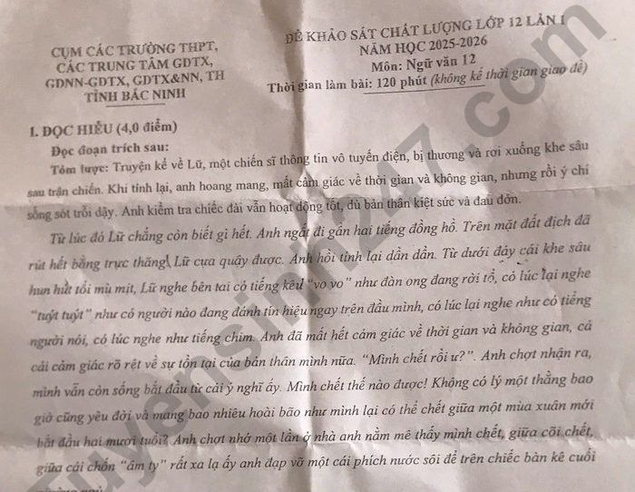 Đề thi thử môn Văn TN THPT 2026 lần 1 - Cụm trường THPT, TT GDTX, GDNN Bắc Ninh Câu 3. Phân tích hiệu quả của việc sử dụng biện pháp liệt kê trong câu văn: Trong vùng ánh sáng tròn tròn xanh xanh màu lá cây chỉ bằng miệng chén, Lữ quan sát chung quanh thấy những đám tàu trơn nhẫy, một tảng đá nằm dưới chân và hình như chỗ nào cũng có cây cối cành lá xanh tốt. Câu 4. Nhận xét về phẩm chất của nhân vật Lữ được thể hiện qua chi tiết: Lữ mừng đến muốn trào nước mắt khi anh nhận ra cái vật đang đè trĩu ngay trên ngực mình vẫn là chiếc đài. Câu 5. Từ nội dung văn bản, anh/chị hãy trình bày suy nghĩ về tinh thần trách nhiệm trong cuộc sống hiện đại (trình bày trong khoảng 5 - 7 dòng).