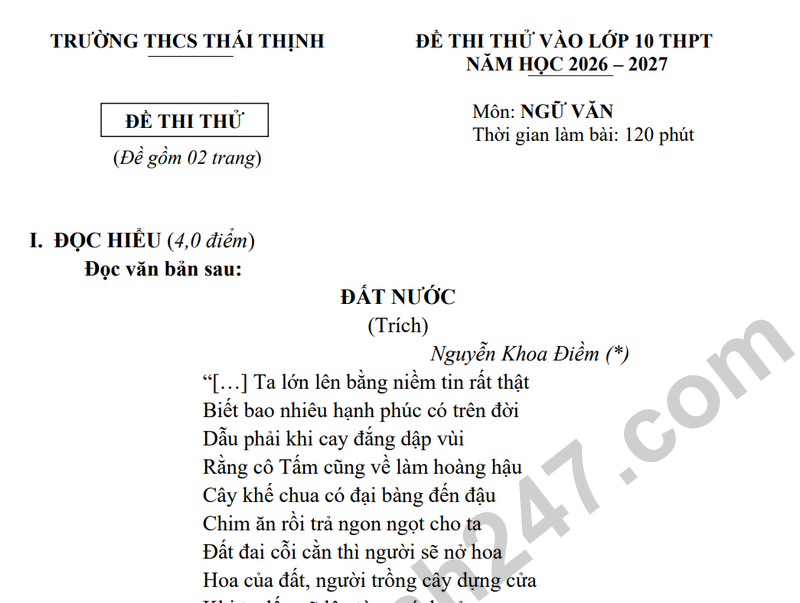Đề thi thử môn Văn vào lớp 10 THPT trường THCS Thái Thịnh