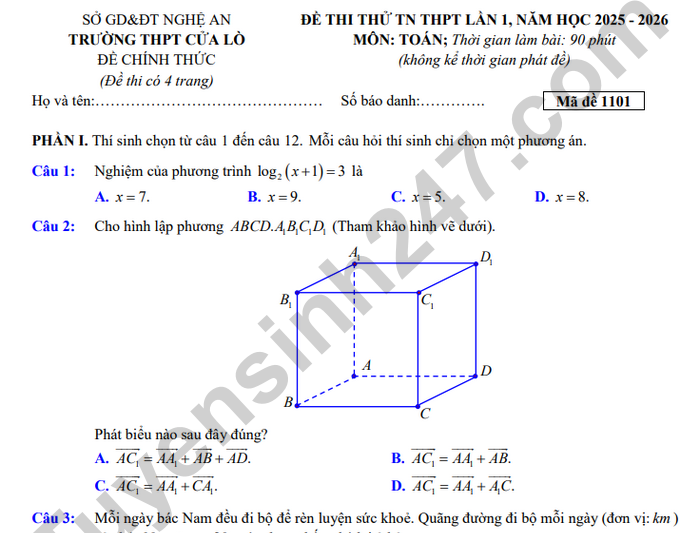 Đề thi thử TN THPT 2026 lần 1 môn Toán - THPT Cửa Lò (có đáp án) Câu 5: Bốn ngư dân góp vốn mua chung một chiếc thuyền. Số tiền người đầu đóng góp bằng nửa tổng số tiền của ba người còn lại. Số tiền người thứ hai đóng góp bằng - tổng số tiền của ba người còn lại. Số tiền người thứ ba đóng góp bằng ẩ tổng số tiền 3 người còn lại. Biết người thứ tư đóng góp 260 triệu đồng. Chiếc thuyền này được mua bao nhiêu tỉ đồng? Câu 6: Hệ thống định vị toàn cầu GPS là một hệ thống cho phép xác định vị trí của một vật thể trong không gian. Trong cùng một thời điểm vị trí của điểm M trong không gian sẽ được xác định bởi bốn vệ tinh cho trước nhờ các bộ thu phát tín hiệu đặt trên các vệ tinh. Giả sử trong không gian với hệ tọa độ Oxyz,có bốn vệ tinh lần lượt đặt tại các điểm A(0;4;5),B(3;0;5), C(3;4;0), D(3;4;5) và vị trí M(a;b;c) trên đoạn thẳng AB thỏa mãn tổng khoảng cách từ các điểm A,B,C đến đường thẳng MD lớn nhất. Khi đó giá trị a+b+c bằng bao nhiêu?