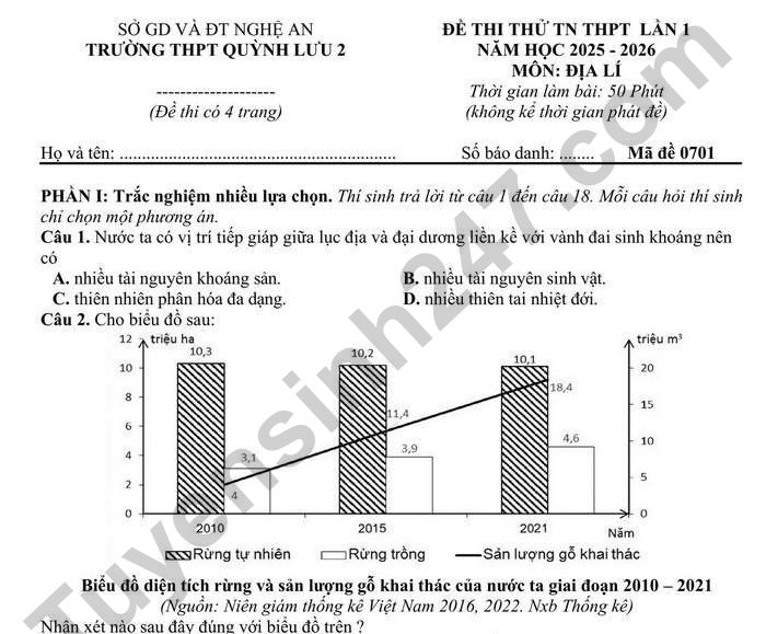 Đề thi thử TN THPT lần 1 năm 2026 môn Địa - THPT Quỳnh Lưu 2