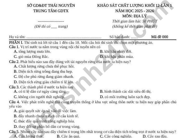 Đề thi thử TN THPT môn Địa 2026 lần 1 - Trung Tâm GDTX Thái Nguyên Câu 10. Quá trình phân công lao động xã hội nước ta chậm chuyển biến chủ yếu do A. quy mô dân số lớn, cơ cấu dân số trẻ, tốc độ gia tăng dân số giảm nhưng vẫn còn cao. B. quá trình đô thị hóa diễn ra chậm, trình độ đô thị hóa thấp và phân bố đô thị đồng đều. C. cơ cấu kinh tế chuyển dịch chậm, chất lượng, năng suất và thu nhập của lao động thấp. D. phân bố lao động không đều giữa các ngành, các thành phần kinh tế và giữa các vùng. Câu 11. Ngành trồng trọt ở nước ta đang có xu hướng đa dạng hóa sản phẩm nhằm mục đích chủ yếu là