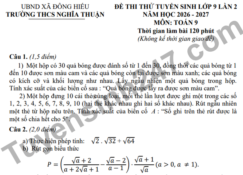Đề thi thử Toán vào 10 năm 2026 trường THCS Nghĩa Thuận Câu 1. (1,5 điểm) 1) Một hộp có 30 quả bóng được đánh số từ 1 đến 30, đồng thời các quả bóng từ 1 đến 10 được sơn màu cam và các quả bóng còn lại được sơn màu xanh; các quả bóng có kích cỡ và khối lượng như nhau. Lấy ngẫu nhiện một quả bóng trong hộp. Tính xác suất của các biến cố sau : “Quả bóng được lấy ra được sơn màu cam”. 2) Một hộp đựng 10 cái thẻ cùng loại, mỗi thẻ lần lượt được ghi một trong các số 1, 2, 3, 4, 5, 6, 7, 8, 9, 10 (hai thẻ khác nhau ghi hai số khác nhau). Rút ngẫu nhiên một thẻ từ hộp nêu trên. Tính xác suất của biến cố A : “Số ghi trên thẻ rút được là một số chia hết cho 5”.