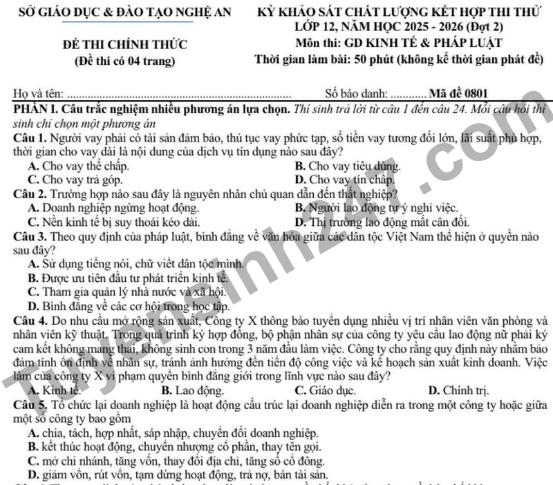 Đề thi thử tốt nghiệp môn GDKT&PL sở Nghệ An năm 2026