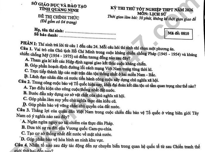 Đề thi thử tốt nghiệp môn Sử 2026 - Sở GD Quảng Ninh