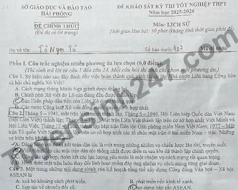 Đề thi thử tốt nghiệp môn Sử - Sở GD Hải Phòng năm 2026
