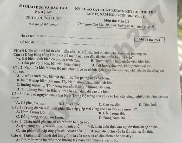 Đề thi thử tốt nghiệp THPT 2026 đợt 2 môn Địa - Sở GD Nghệ An Câu 16: Đặc điểm nào sau đây đúng với sự phát triển các ngành công nghiệp nước ta hiện nay? A. Sản xuất thực phẩm tạo ra nhiều mặt hàng xuất khẩu có giá trị. B. Sản xuất giày, dép có nguồn nguyên liệu trong nước khá dồi dào. C. Sản xuất sản phẩm điện tử, máy vi tính có tốc độ tăng trưởng chậm. D. Khai thác dầu mỏ, khí tự nhiên chỉ tiến hành ở trong nước. Câu 17: Làng nghề nào sau đây ở nước ta thuộc nhóm sản xuất hàng thủ công mĩ nghệ? A. Chạm khắc, chế tác đá. C. Trồng hoa và cây cảnh. B. Chế biến sợi từ xơ dừa. D. Chế biến chè, thuốc nam.