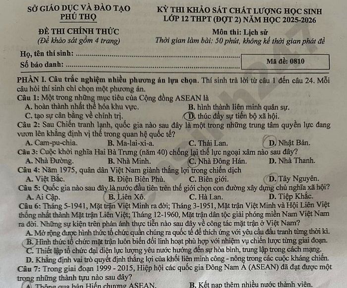 Đề thi thử tốt nghiệp THPT 2026 đợt 2 môn Sử - Sở GD Phú Thọ