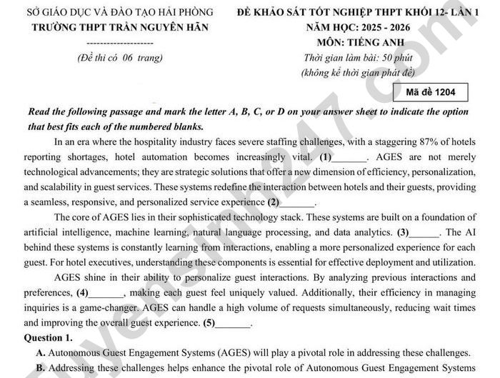 Đề thi thử tốt nghiệp THPT 2026 lần 1 môn Anh - THPT Trần Nguyên Hãn Question 3. A. This blend of technologies allows AGES to understand and respond to guest queries in a natural, intuitive manner. B. Using this blend of technologies, hotels allow AGES to understand and respond to guest queries in a natural, intuitive manner. C. Without this blend of technologies, AGES could understand and respond to guest queries in a natural, intuitive manner. D. AGES understand and respond to guest queries in a natural, intuitive manner so that these technologies can be blended