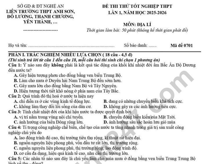 >>> Xem thêm lời giải chi tiết các đề thi thử Tốt nghiệp THPT 2026 môn Địa của các Sở GD, các trường THPT trên cả nước TẠI ĐÂY Theo TTHN 🔥 2K8 CHÚ Ý! LUYỆN THI TN THPT - ĐÁNH GIÁ NĂNG LỰC - ĐÁNH GIÁ TƯ DUY!