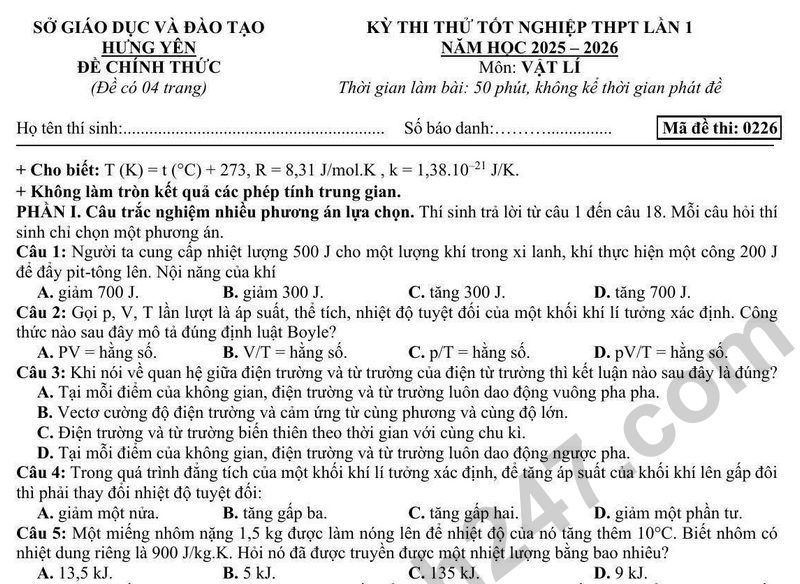 Đề thi thử tốt nghiệp THPT 2026 lần 1 môn Vật lý - Sở GD&ĐT Hưng Yên