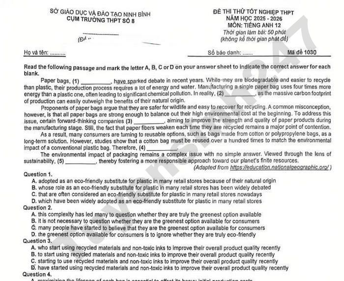 Đề thi thử tốt nghiệp THPT 2026 môn Anh - Cụm trường THPT số 8 Ninh Bình