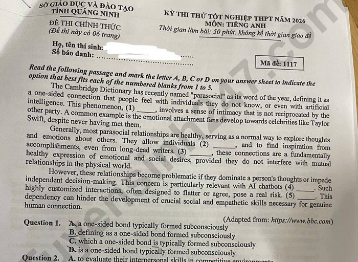 Đề thi thử tốt nghiệp THPT 2026 môn Anh - Quảng Ninh Question 31. A. to evaluate their interpersonal skills in competitive environments B. to align their personal values with expectations of their social circle. C. to bypass the need for any real-world social interaction D. to understand their own place within the broader social landscape Question 32. A. Despite the potential for social withdrawal in extremely isolated individuals B. Given these beneficial psychological and emotional outlets they provide C. Rather than the replacement of the necessary social bonds in our daily lives D. Regardless of the involvement of either living or deceased figures Lưu ý: Đáp án trong đề là bài làm của học sinh, có thể không chính xác
