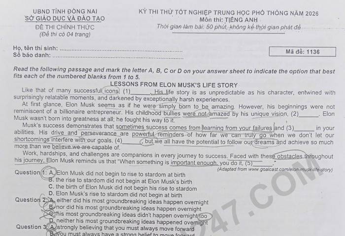 Đề thi thử tốt nghiệp THPT 2026 môn Anh - Sở GD Đồng Nai Question 13: The reference to artists in paragraph 1 primarily serves to A. illustrate that flow is psychologically challenging but manageable B.explain the research method Csikszentmihalyi used to study flow Cargue that flow is most commonly found in creative professions D. provide an early example of a characteristic associated with flow Question 14: According to paragraph 2, which of the following is NOT a characteristic or condition of flow? Lưu ý:Đáp án trong đề là bài làm của học sinh, có thể không chính xác