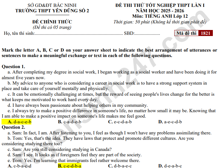 Đề thi thử tốt nghiệp THPT 2026 môn Anh - THPT Yên Dũng số 2 Question 1. a. After completing my degree in social work, I began working as a social worker and have been doing it for almost five years now. b. My advice to anyone who is considering a career in social work is to have a strong support system in place and take care of yourself mentally and physically. c. It can be emotionally challenging at times, but the reward of seeing people's lives change for the better is what keeps me motivated to work hard every day. d. I have always been passionate about helping others in my community. e. I always try to make a positive difference in someone's life, no matter how small it may be. Knowing that I am able to make a positive impact on someone's life makes me feel good.