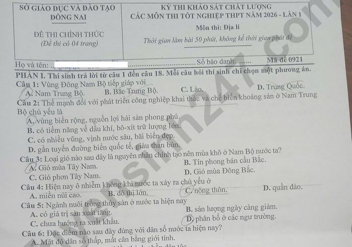 Đề thi thử tốt nghiệp THPT 2026 môn Địa lần 1 - Sở GD Đồng Nai Câu 2: Cho thông tin sau: Vùng Bắc Trung Bộ gồm các tỉnh Thanh Hóa, Nghệ An, Hà Tĩnh, Quảng Trị và thành phố Huế. Lãnh thổ kéo dài từ bắc vào nam, hẹp ngang và phân hóa thành nhiều dạng địa hình, từ tây sang đông là đồi, núi — dải đồng bằng ven biển – vùng biển đảo và thềm lục địa. a) Thuận lợi chủ yếu về tự nhiên để phát triển ngành thuỷ sản khai thác ở vùng Bắc Trung Bộ là có nhiều ngư trường trọng điểm và ít thiên tại. b) Các tỉnh, thành phố của vùng Bắc Trung Bộ đều giáp biển. c) Ý nghĩa chủ yếu của việc phát triển rừng phòng hộ ở vùng Bắc Trung Bộ là tạo ra nguồn nguyên liệu cho ngành công nghiệp, nâng cao thu nhập và hạn chế lũ quét. Lưu ý: Đáp án trong đề là bài làm của học sinh, có thể không chính xác