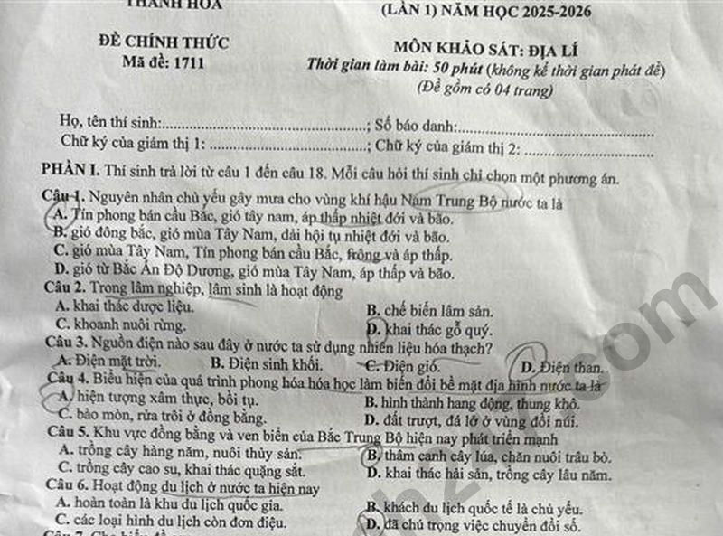 Đề thi thử tốt nghiệp THPT 2026 môn Địa lí lần 1 - Sở GD Thanh Hóa