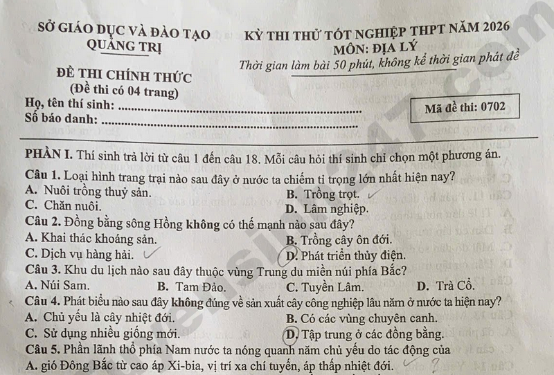 Đáp án đề thi thử tốt nghiệp THPT 2026 môn Địa Lý - Sở GD Quảng Trị