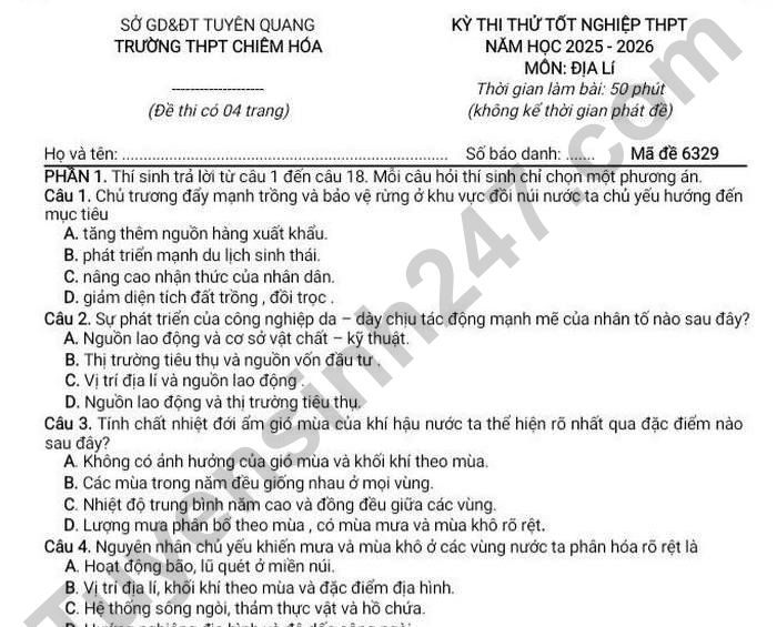 >>> Xem thêm lời giải chi tiết các đề thi thử Tốt nghiệp THPT 2026 môn Địa của các Sở GD, các trường THPT trên cả nước TẠI ĐÂY Theo TTHN 🔥 2K8 CHÚ Ý! LUYỆN THI TN THPT - ĐÁNH GIÁ NĂNG LỰC - ĐÁNH GIÁ TƯ DUY!