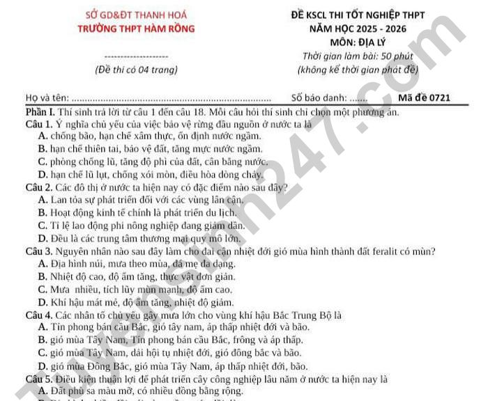 >>> Xem thêm lời giải chi tiết các đề thi thử Tốt nghiệp THPT 2026 môn Địa của các Sở GD, các trường THPT trên cả nước TẠI ĐÂY Theo TTHN 🔥 2K8 CHÚ Ý! LUYỆN THI TN THPT - ĐÁNH GIÁ NĂNG LỰC - ĐÁNH GIÁ TƯ DUY!