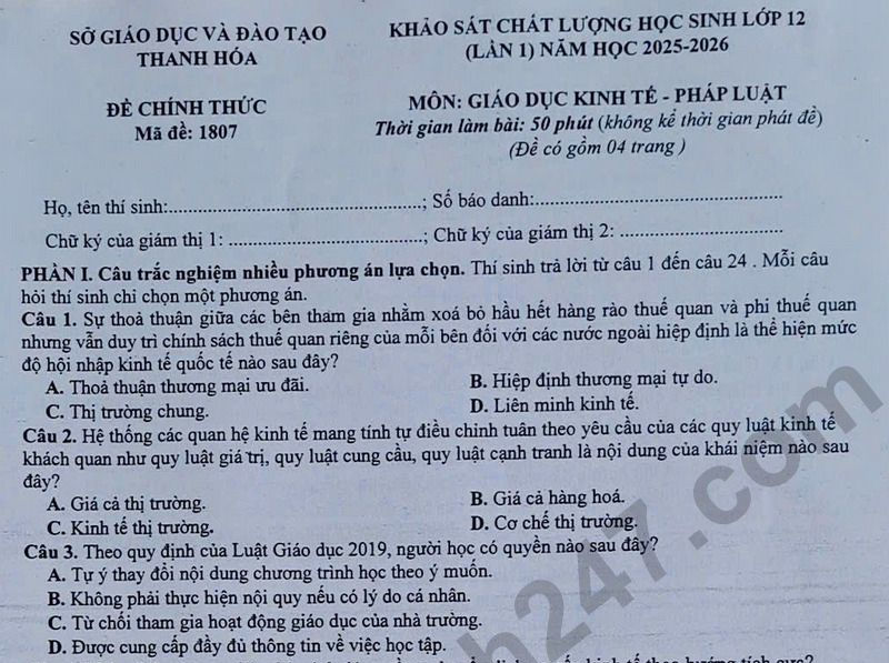 Đề thi thử tốt nghiệp THPT 2026 môn Giáo dục Kinh tế - Pháp luật lần 1 - Sở GD Thanh Hóa