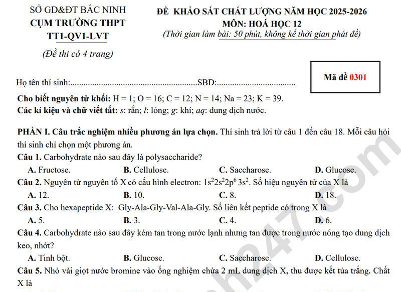 Đáp án đề thi thử tốt nghiệp THPT môn Hóa 2026 - Cụm trường Bắc Ninh