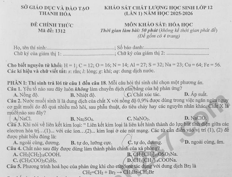 Đáp án đề thi thử tốt nghiệp THPT 2026 môn Hóa lần 1 - Sở GD Thanh Hóa