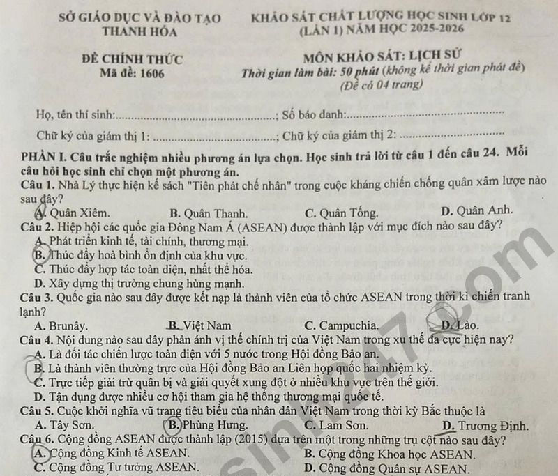 Đề thi thử tốt nghiệp THPT 2026 môn Lịch sử lần 1 - Sở GD&ĐT Thanh Hóa