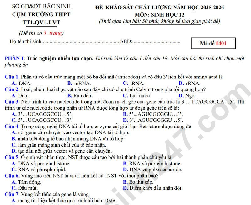 Đáp án đề thi thử tốt nghiệp THPT 2026 môn Sinh