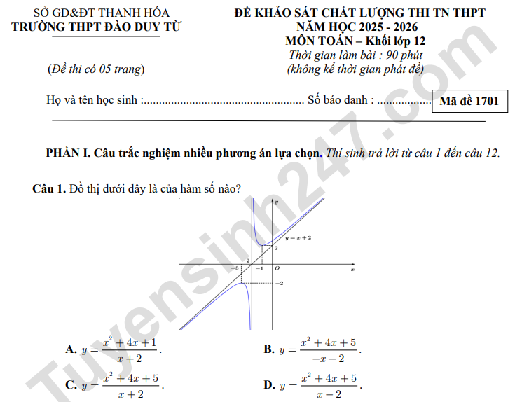Đáp án đề thi thử tốt nghiệp THPT 2026 môn Toán 2026 - THPT Đào Duy Từ