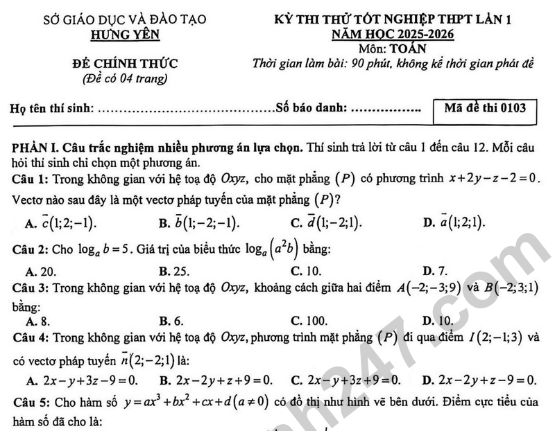 Đề thi thử tốt nghiệp THPT 2026 môn Toán lần 1 sở GD&ĐT Hưng Yên