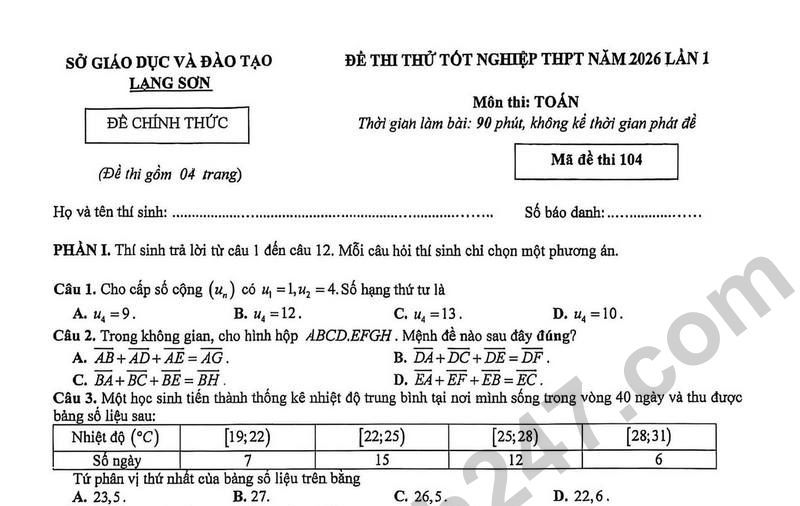 Đề thi thử tốt nghiệp THPT 2026 lần 1 môn Toán Sở GDĐT Lạng Sơn