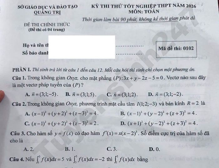 Đề thi thử tốt nghiệp THPT 2026 môn Toán - Sở GD Quảng Trị