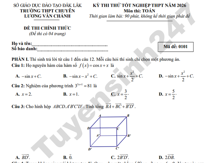 Đề thi thử tốt nghiệp THPT 2026 môn Toán - THPT Chuyên Lương Văn Chánh