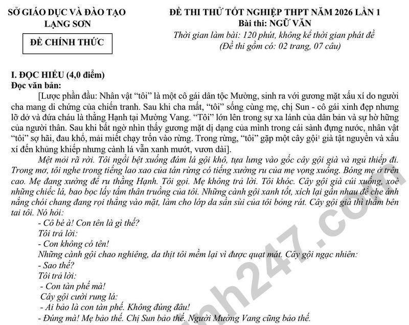 Đề thi thử tốt nghiệp THPT 2026 môn Văn lần 1 Sở GDĐT Lạng Sơn