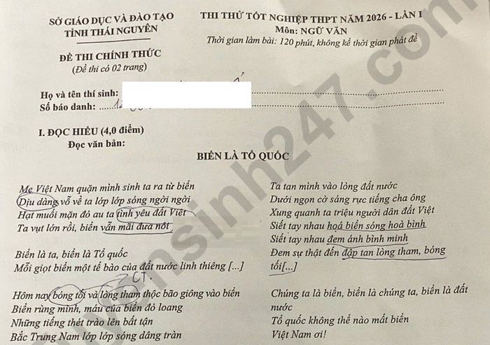 Đề thi thử tốt nghiệp THPT 2026 môn Văn lần 1 - tỉnh Thái Nguyên