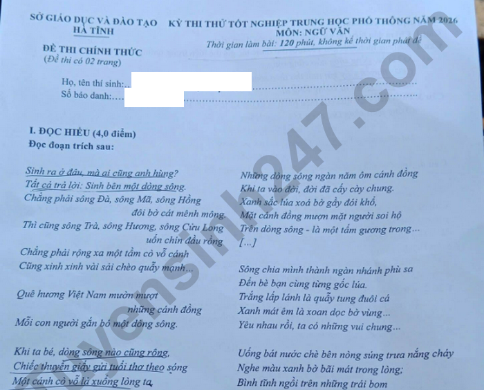 Đề thi thử tốt nghiệp THPT 2026 môn Văn - Sở GD Hà Tĩnh