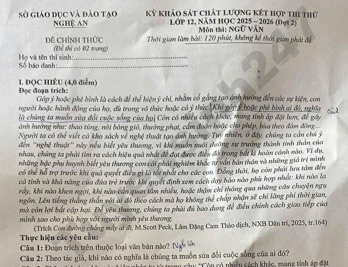 Đề thi thử tốt nghiệp THPT 2026 môn Văn - Sở GD Nghệ An (đợt 2) Thực hiện các yêu cầu: Câu 1: Đoạn trích trên thuộc loại văn bản nào? Nghe lâu Câu 2: Theo tác giả, khi nào có nghĩa là chúng ta muốn sửa đổi cuộc sống của ai đó? Câu 3: Phân tích ý nghĩa của biện pháp tu từ trong câu: “Còn có nhiều cách khác, mang tính áp đặt hơn, để gây ảnh hưởng như: thao túng, nói bóng gió, thưởng phạt, cấm đoán hoặc cho phép, hùa theo đám đông...” Câu 4: Vì sao tác giả chọn dẫn chứng phụ huynh giáo dục con cái để làm rõ quan điểm ứng xử xuất phát từ yêu thương?
