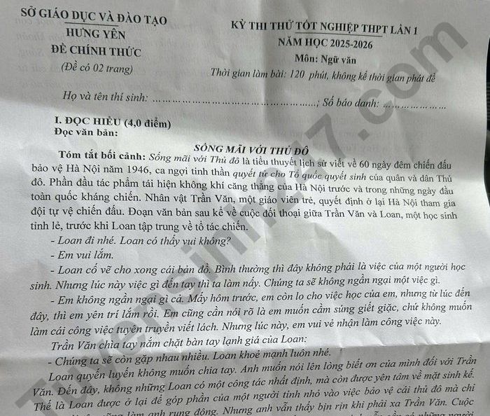 Đề thi thử tốt nghiệp THPT 2026 môn Văn - Sở GDĐT Hưng Yên (lần 1)