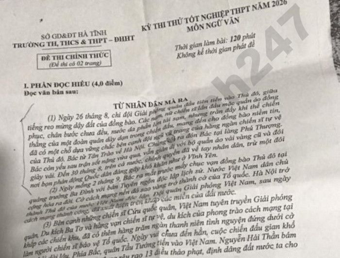 Đề thi thử tốt nghiệp THPT 2026 môn Văn - TH, THCS&THPT ĐHHT Câu 1. (0,5 điểm) Những sự kiện, câu chuyện trong văn bản được kể lại từ điểm nhìn các nhân vật nào? Câu 2. 10,5 điểm) Tính xác thực của thể hồi kí được thể hiện qua những yếu tố nào trong ban? Câu 3. (1,0 điểm) Việc sử dụng kết hợp ngôn ngữ thân mật và ngôn ngữ trang trọng trong đoạn (1) mang lại hiệu quả gì? Câu 4. (1,0 điểm) Anh/chị hiểu thế nào về nhan đề của văn bản: Từ nhân dân mà ra? Câu 5. (1,0 điểm) Từ nội dung của văn bản, anh/chị có suy nghĩ gì về sức mạnh đoàn kết của dân tộc ta trong kháng chiến chống giặc ngoại xâm, bảo vệ Tổ quốc? (trình bày khoảng 5-7 dòng)