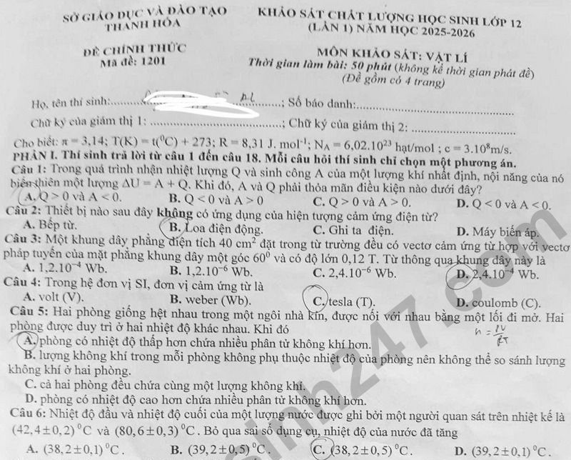 Đáp án đề thi thử tốt nghiệp THPT 2026 môn Vật lý lần 1 - Sở GD Thanh Hóa