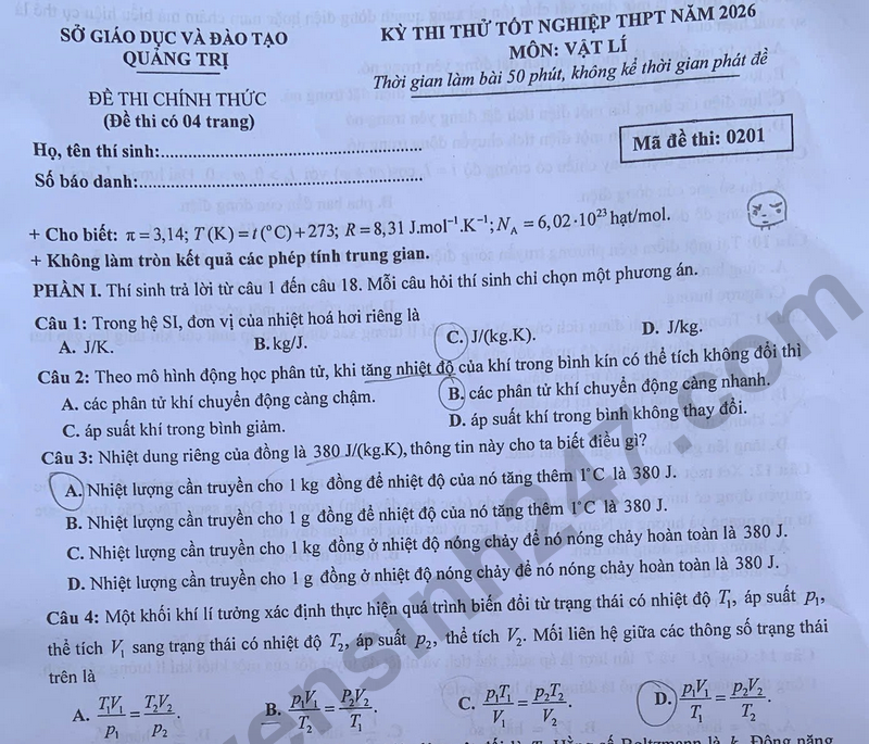 Đáp án đề thi thử tốt nghiệp THPT 2026 môn Vật lý - Sở GD Quảng Trị