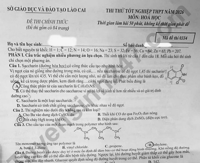 Đề thi thử tốt nghiệp THPT 2026 Sở GDĐT Lào Cai - môn Hóa