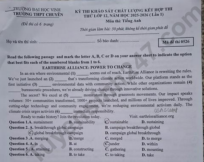 Đề thi thử tốt nghiệp THPT môn Anh 2026 - Chuyên ĐH Vinh lần 1