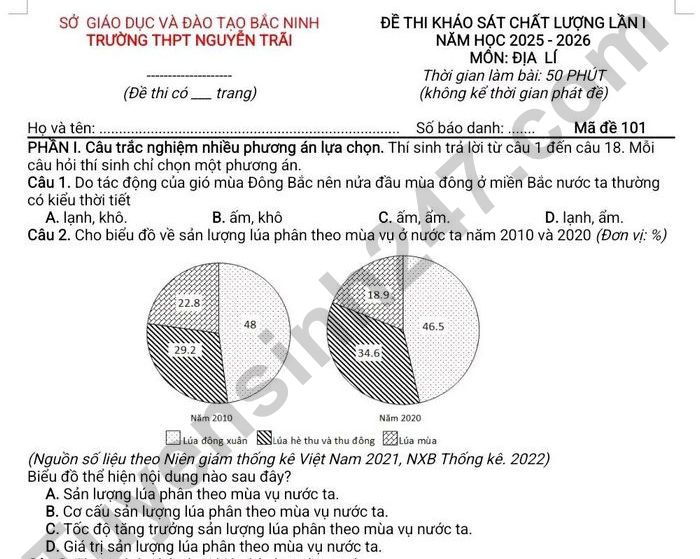Đề thi thử tốt nghiệp THPT môn Địa 2026 - THPT Nguyễn Trãi lần 1 PHẦN III. Cấu trắc nghiệm trả lời ngắn. Thí sinh trả lời từ câu 1 đến câu 6. Câu 1. Theo Niên giám Thống kê năm 2023, diện tích Việt Nam là 331344,8 km và dân số Việt Nam tính đến tháng 12 năm 2023 là 100,3 triệu người. Vậy, mật độ dân số Việt Nam tính đến tháng 12 năm 2023 là bao nhiêu người/km” (làm tròn kết quả đến hàng đơn vị)? Câu 2. Biết diện tích gieo trồng lúa nước ta là 7,2 triệu ha, sản lượng lúa là 43,9 triệu tấn (năm 2021). Hãy cho biết năng suất lúa của nước ta năm 2021 là bao nhiêu tạ/ha? (làm tròn kết quả đến chữ số thập phân thứ nhất của tạ/ha)?